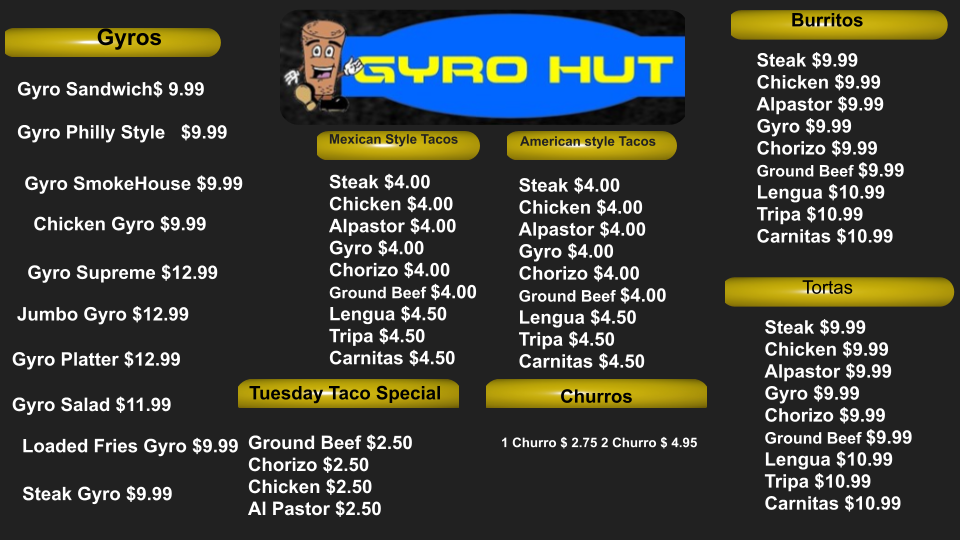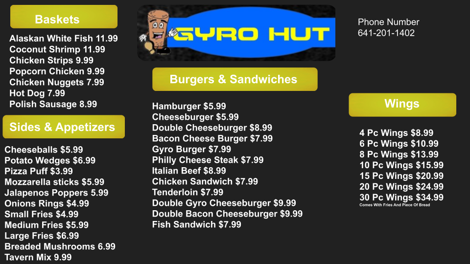 Tony's Gyros Formerly Known As Gyro Hut (In Mason City) Menu offers a mouthwatering collection of Greek-inspired favorites, perfect for those craving something flavorful and satisfying. Located at 1343 N Federal Ave in Mason City, IA, this spot brings the vibrant flavors of Greece right to your plate. The menu is packed with all-time favorites like juicy gyros, tender souvlaki, and crispy fries, with a variety of sides and sauces to complement every bite.